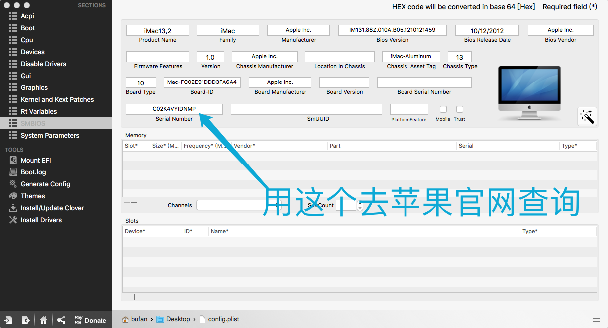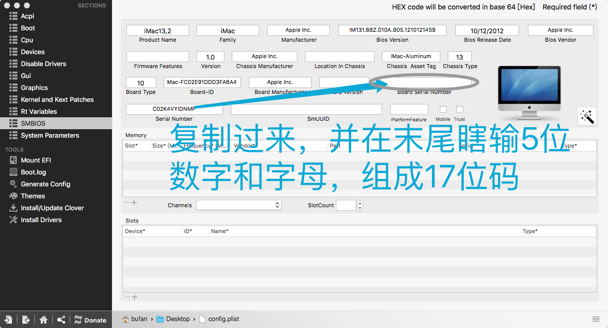 • 将可用的serial码复制到”Board Serial Number”字段中,并在末尾瞎输5个数字字母,最终达到17个字符。举个例子:“序列号是:A648A5B45Q5D(12位,注意老机子在SMBIOS里只有11位加了5位后也只有16位,所以尽量选新机形,但必需要适配你的机子和关于本机里的序列号对应)在后面随便加5位A648A5B45Q5DDA562共17位”。