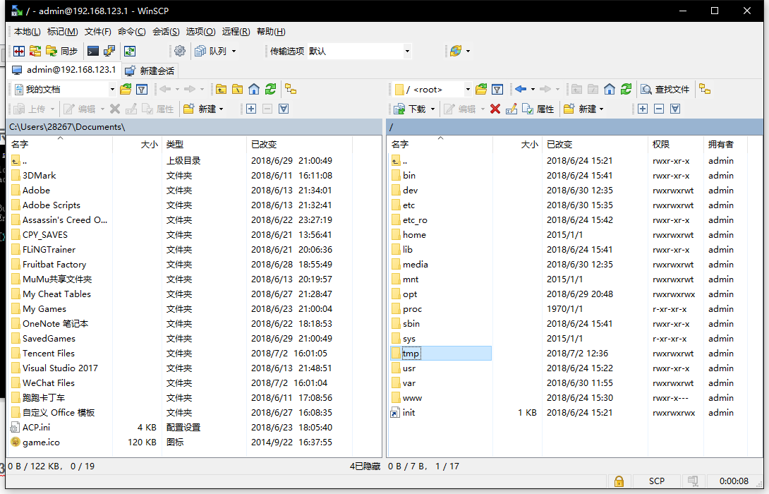 这时用WinSCP上传我们刚下载的breed-mt7621-xiaomi-r3g.bin到/tmp下取名叫breed.bin