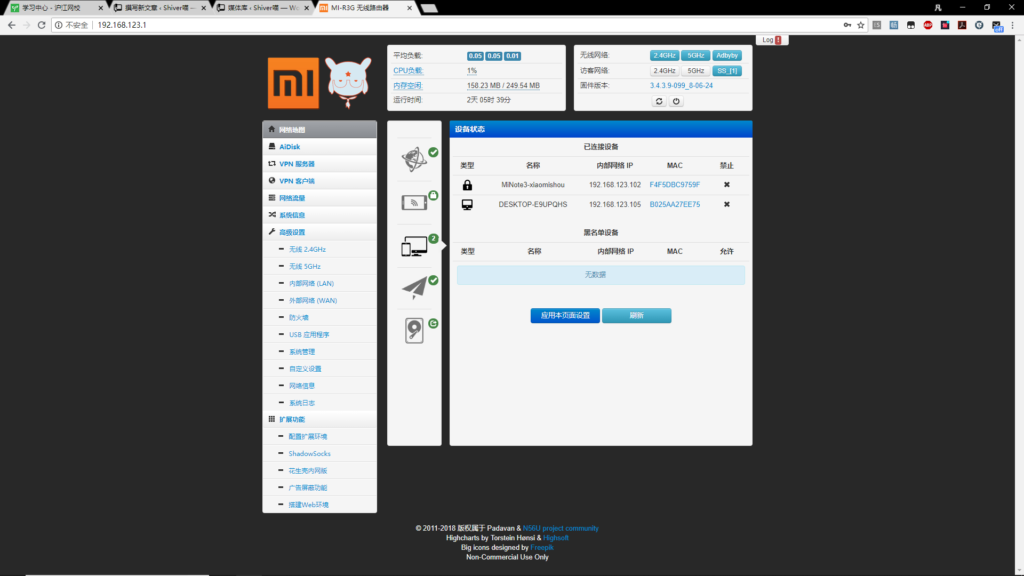 该固件功能非常多样,ss,adbyby,花生壳,迅雷远程下载,Aria2等等,可以自己探索。